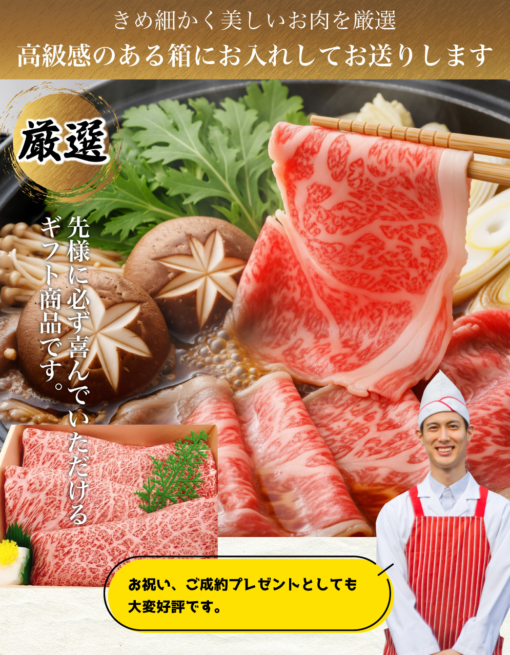 TOP用途から選ぶ すき焼き 店舗受取OK 黒毛和牛 極み すきやき 箱入り800g 価格: ¥10,000 (税込) [ポイント還元 100ポイント〜] 販売期間: 数量: 個 在庫 在庫あり 住所を知らない相手にeギフトで送る eギフトについて eギフトについて eギフトは相手の住所を知らなくてもギフトを送れるサービスです。 eギフト対象商品に表示されている「住所を知らない相手にeギフトで送る」にチェックを入れ購入します。 購入完了画面で発行される受け取り用URLをLINEやSNSを使ってお相手にお送りください。 贈り先の方が受け取り情報を入力後、商品が届きます。 受け取り期限は購入日を含めて5日です。日本国外には商品を発送できません。期限内に受け取りがなかった場合は、購入した商品が送り主に送られます。 閉じる 返品についての詳細はこちら 名称 黒毛和牛 極み すき焼用 箱入り 内容量 800g 賞味期限 パッケージに記載。美味しく食べていただきたいので、到着日より二週間以内にお召し上がりください 保存方法 冷凍 加工業者 有限会社 山重食肉 高知県高知市越前町2丁目6-14