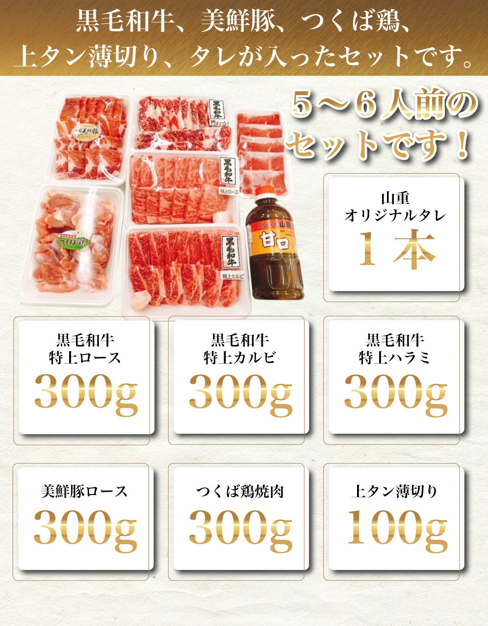 TOP用途から選ぶ 焼肉 店舗受取OK 特上焼肉セット 価格: ¥13,000 (税込) [ポイント還元 130ポイント〜] 販売期間: 数量: 個 在庫 在庫あり 住所を知らない相手にeギフトで送る eギフトについて eギフトについて eギフトは相手の住所を知らなくてもギフトを送れるサービスです。 eギフト対象商品に表示されている「住所を知らない相手にeギフトで送る」にチェックを入れ購入します。 購入完了画面で発行される受け取り用URLをLINEやSNSを使ってお相手にお送りください。 贈り先の方が受け取り情報を入力後、商品が届きます。 受け取り期限は購入日を含めて5日です。日本国外には商品を発送できません。期限内に受け取りがなかった場合は、購入した商品が送り主に送られます。 閉じる 返品についての詳細はこちら 名称 黒毛和牛 特上ロース300g、黒毛和牛 特上カルビ300g、黒毛和牛 特上ハラミ300g、美鮮豚ロース300g、つくば鶏焼肉300g、上タン薄切り100g、山重オリジナルタレ1本 内容量 1600g 賞味期限 パッケージに記載。美味しく食べていただきたいので、到着日より二週間以内にお召し上がりください 保存方法 冷凍 加工業者 有限会社 山重食肉 高知県高知市越前町2丁目6-14