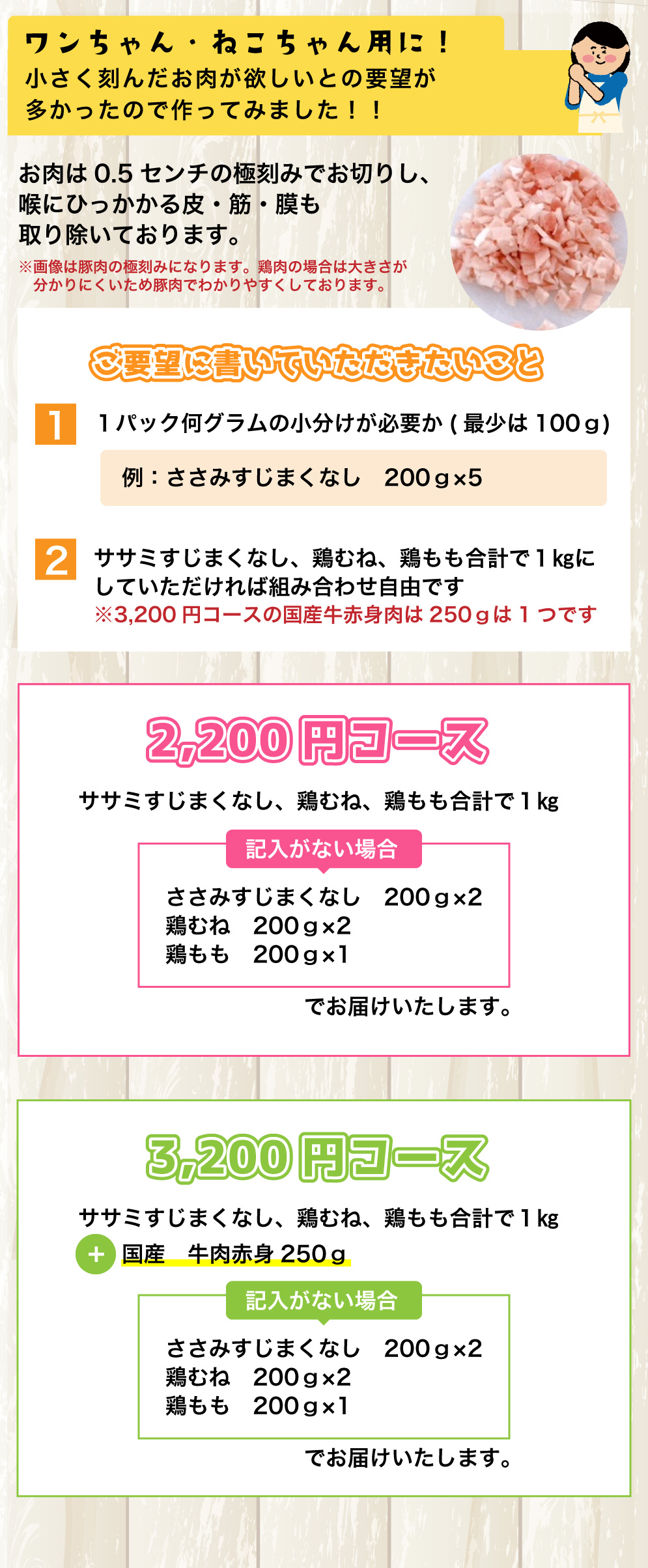 TOP価格帯から探す 1,001〜3,000円 店舗受取OK ワンちゃん・ねこちゃん用 価格: ¥2,200 (税込) ~ ¥3,200 (税込) [ポイント還元 22ポイント〜] 販売期間: コース: 選択してください 2,200円コース 2,200円(税込) 3,200円コース 3,200円(税込) 価格と在庫を一覧で確認する 価格: − 数量: 個 コース価格在庫2,200円コース 2,200円(税込)¥2,200(税込)在庫あり3,200円コース 3,200円(税込)¥3,200(税込)在庫あり 返品についての詳細はこちら 名称 ワンちゃん・ねこちゃん用 極きざみ肉 国産100% 皮・筋・膜なし 内容量 2,200円コース 1?、3,200円コース1.25kg 賞味期限 パッケージに記載。美味しく食べていただきたいので、到着日より二週間以内にお召し上がりください 保存方法 冷凍 加工業者 有限会社 山重食肉 高知県高知市越前町2丁目6-14