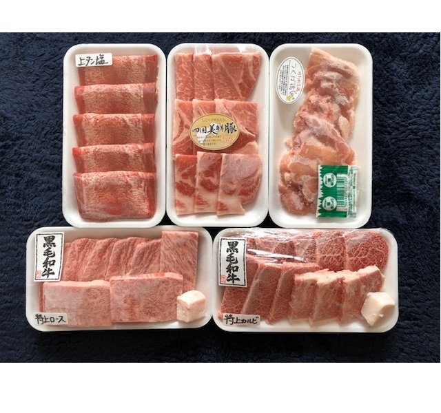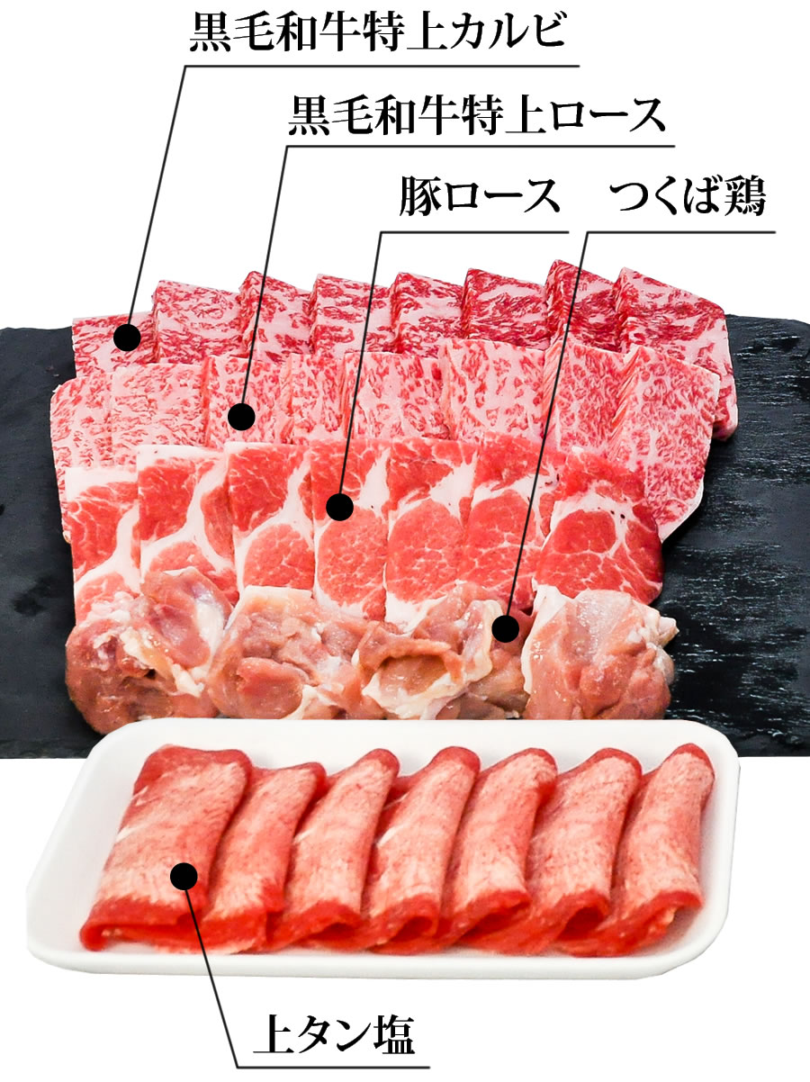 | 内容量 | 黒毛和牛特上ロース 150g 特上カルビ 200g 四国美鮮豚 130g つくば鶏 120g 上タン塩 1パック セット数によってタレ(大or小)をおつけいたします。 |